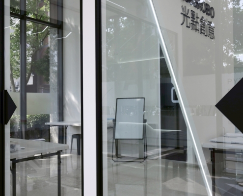 入口以開放式櫥窗展示作為視覺引導,採用大面玻璃與燈條造型設計,營造明亮通透的第一印象,接待大廳以造型天花板與燈條勾勒層次感,搭配品牌識別色的招牌牆,展現出具識別度的現代形象。