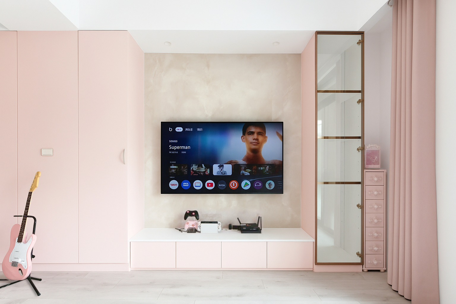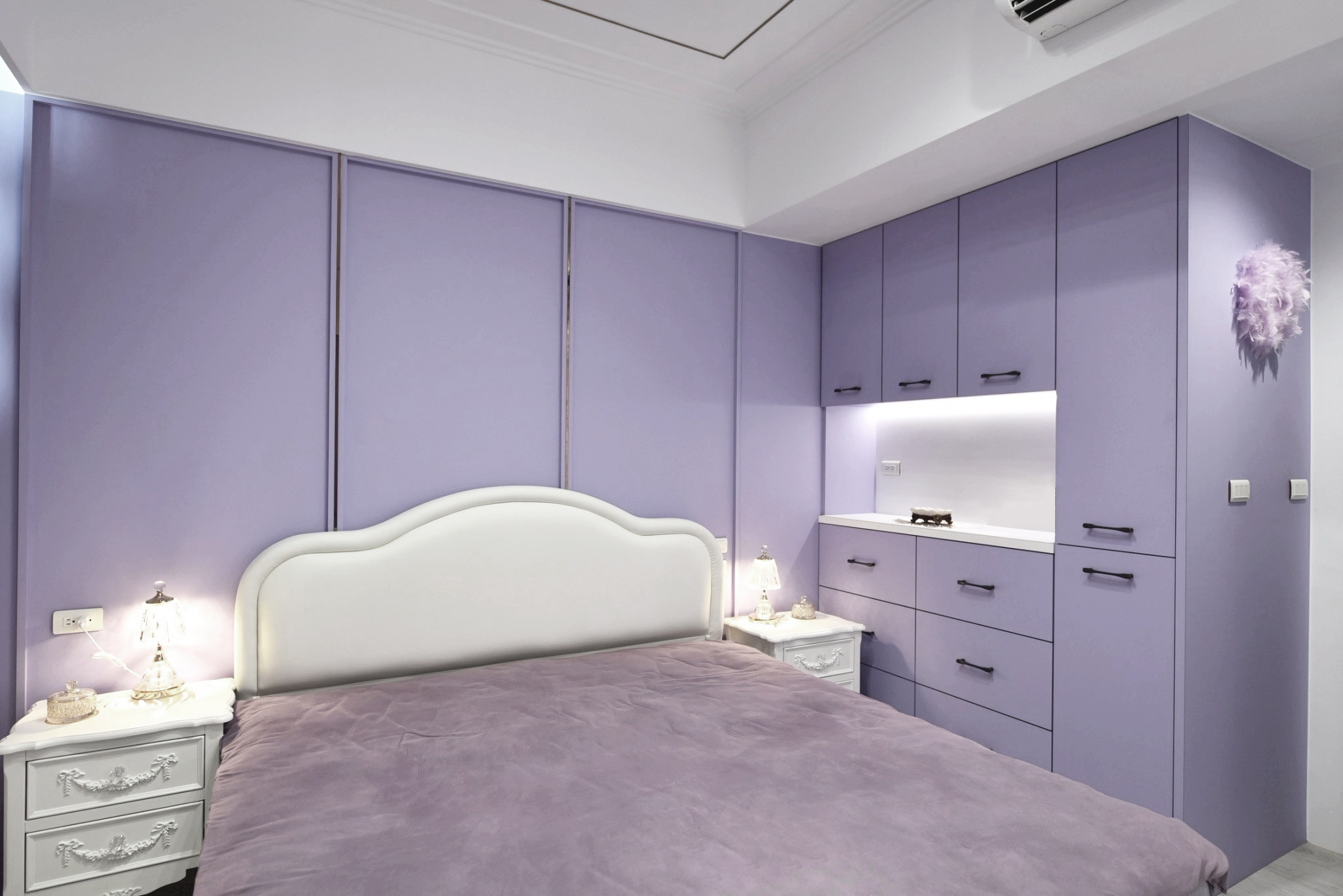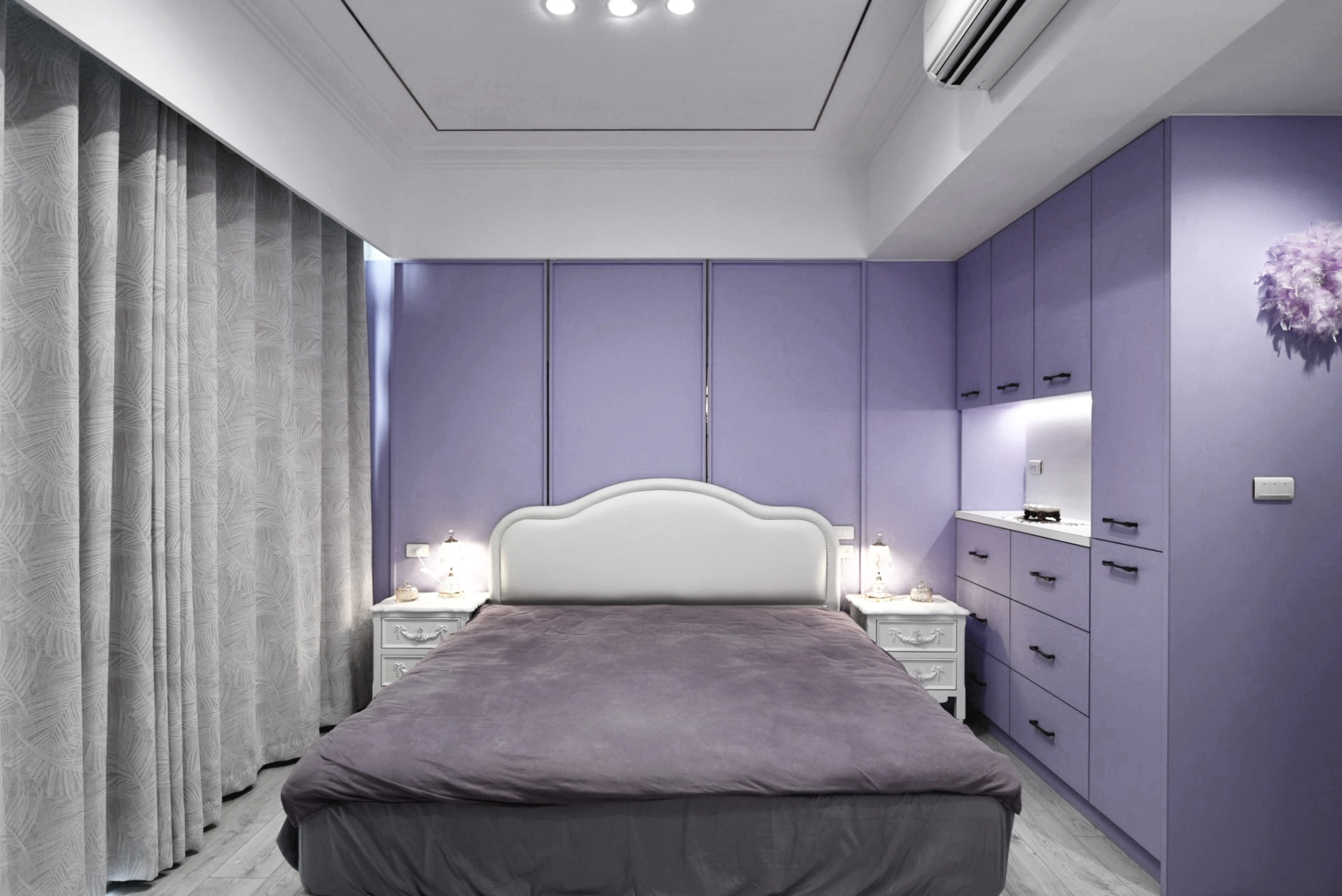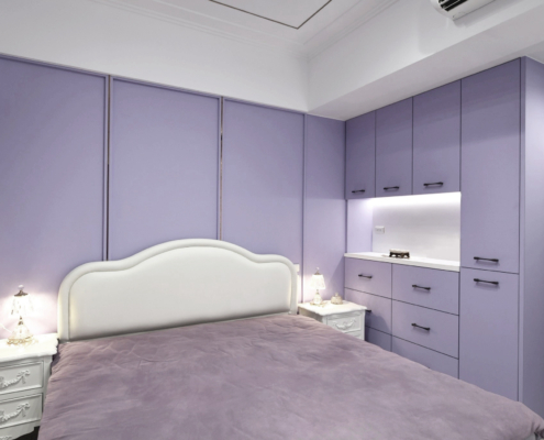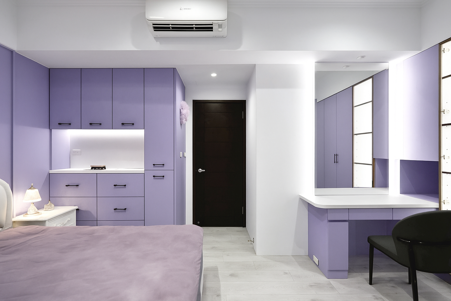 玄關以圓弧造型與羅馬柱語彙拉開序幕,客廳電視牆則選用大板磚結合造型牆面,展現石材的細膩肌理,餐廚區以開放式格局串聯動線,營造輕盈而富有生活感的場域,讓日常聚會更顯自在流暢;主臥以柔和光影搭配粉色公主氛圍,次臥則選用薰衣草紫及靛藍配色。