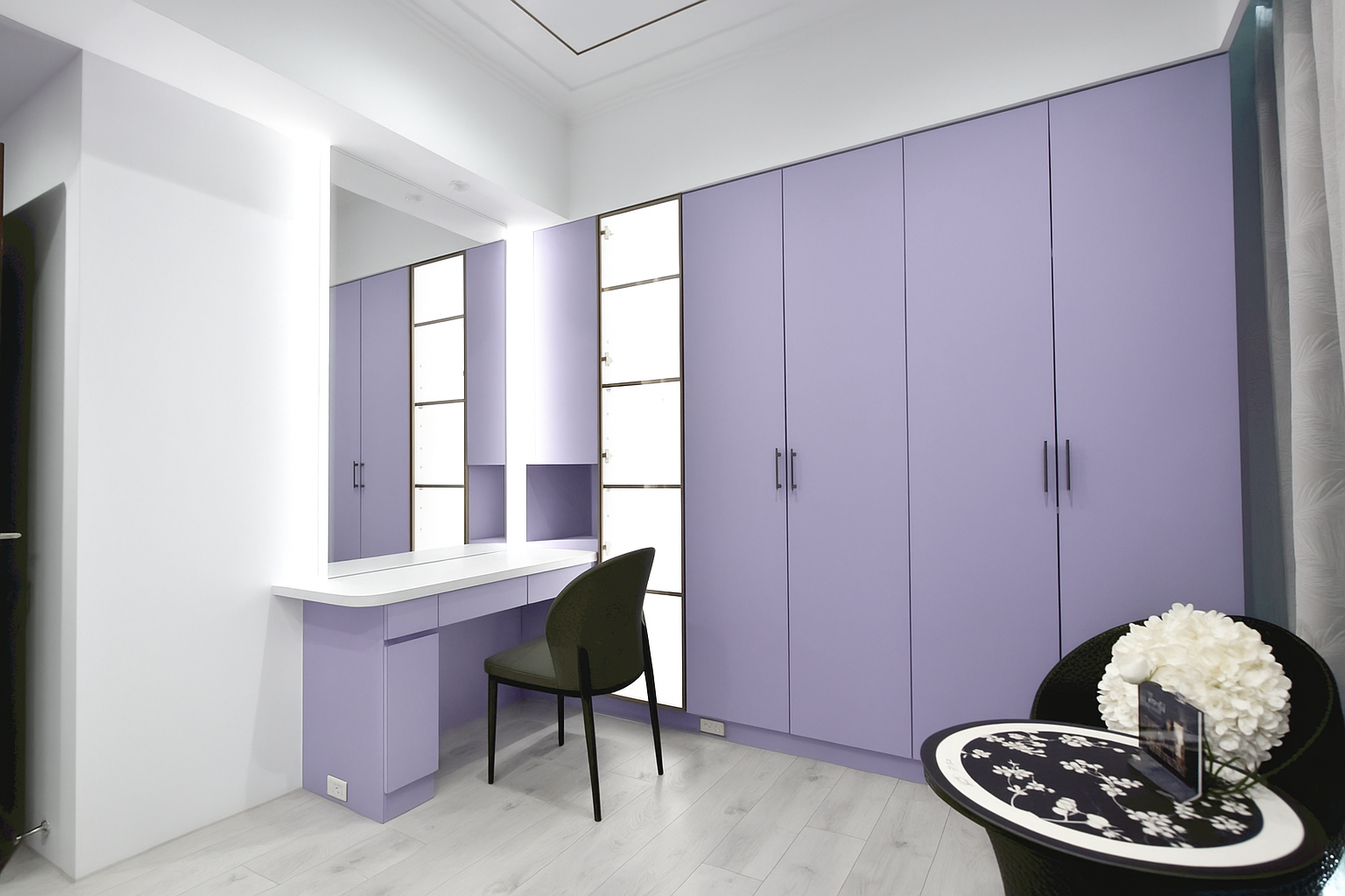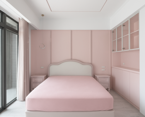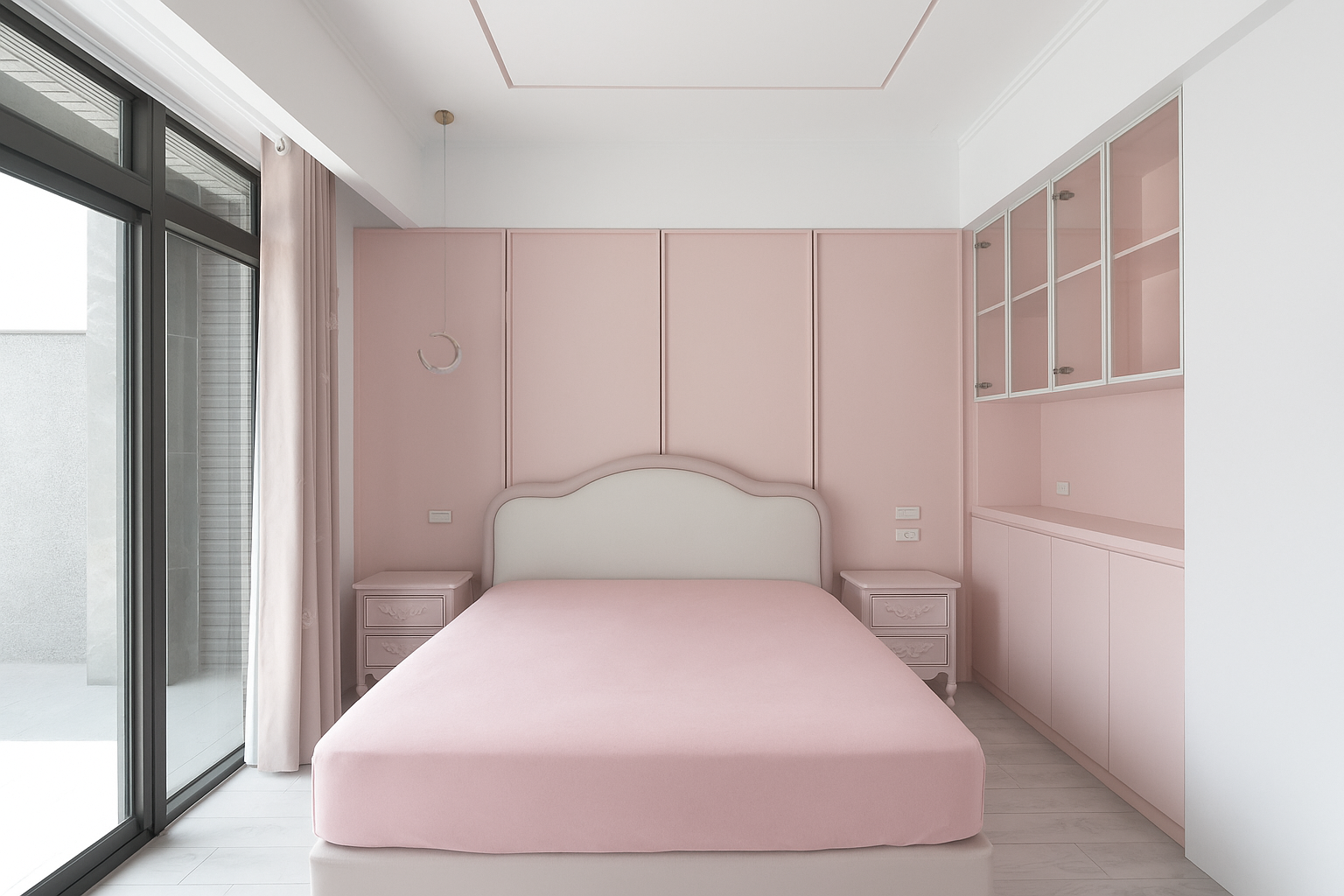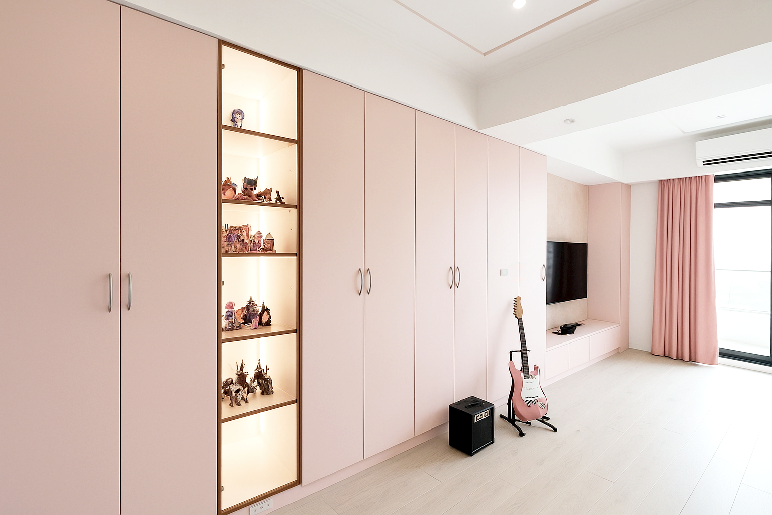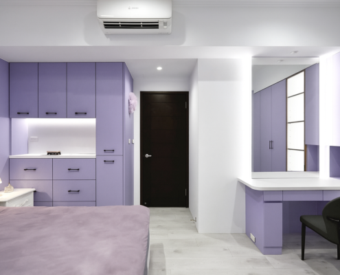 玄關以圓弧造型與羅馬柱語彙拉開序幕,客廳電視牆則選用大板磚結合造型牆面,展現石材的細膩肌理,餐廚區以開放式格局串聯動線,營造輕盈而富有生活感的場域,讓日常聚會更顯自在流暢;主臥以柔和光影搭配粉色公主氛圍,次臥則選用薰衣草紫及靛藍配色。