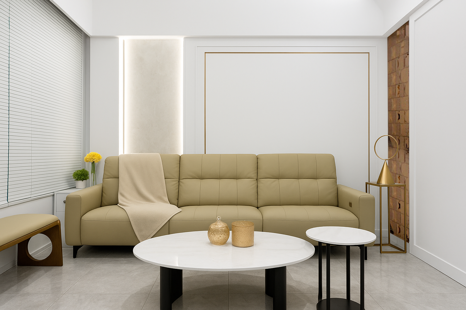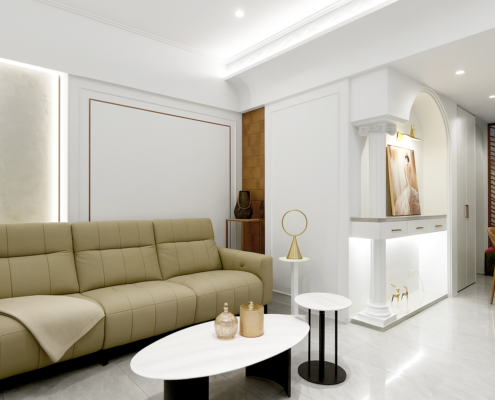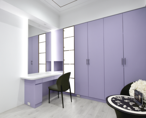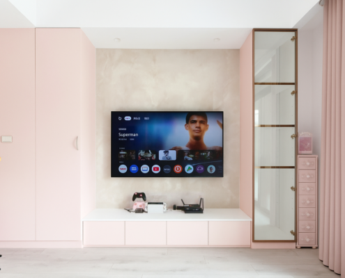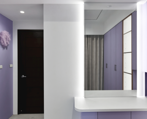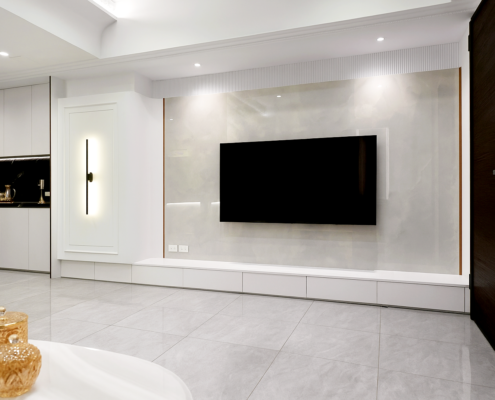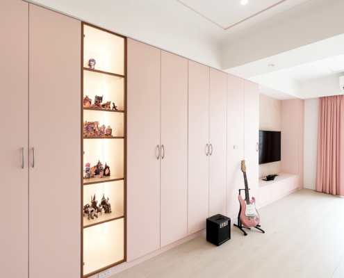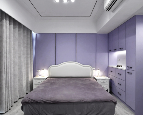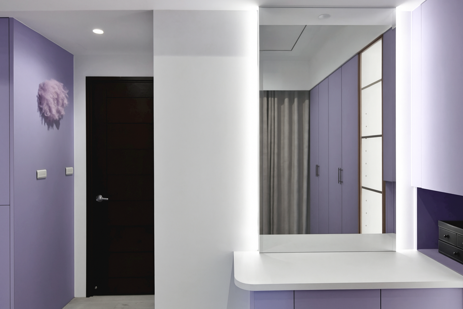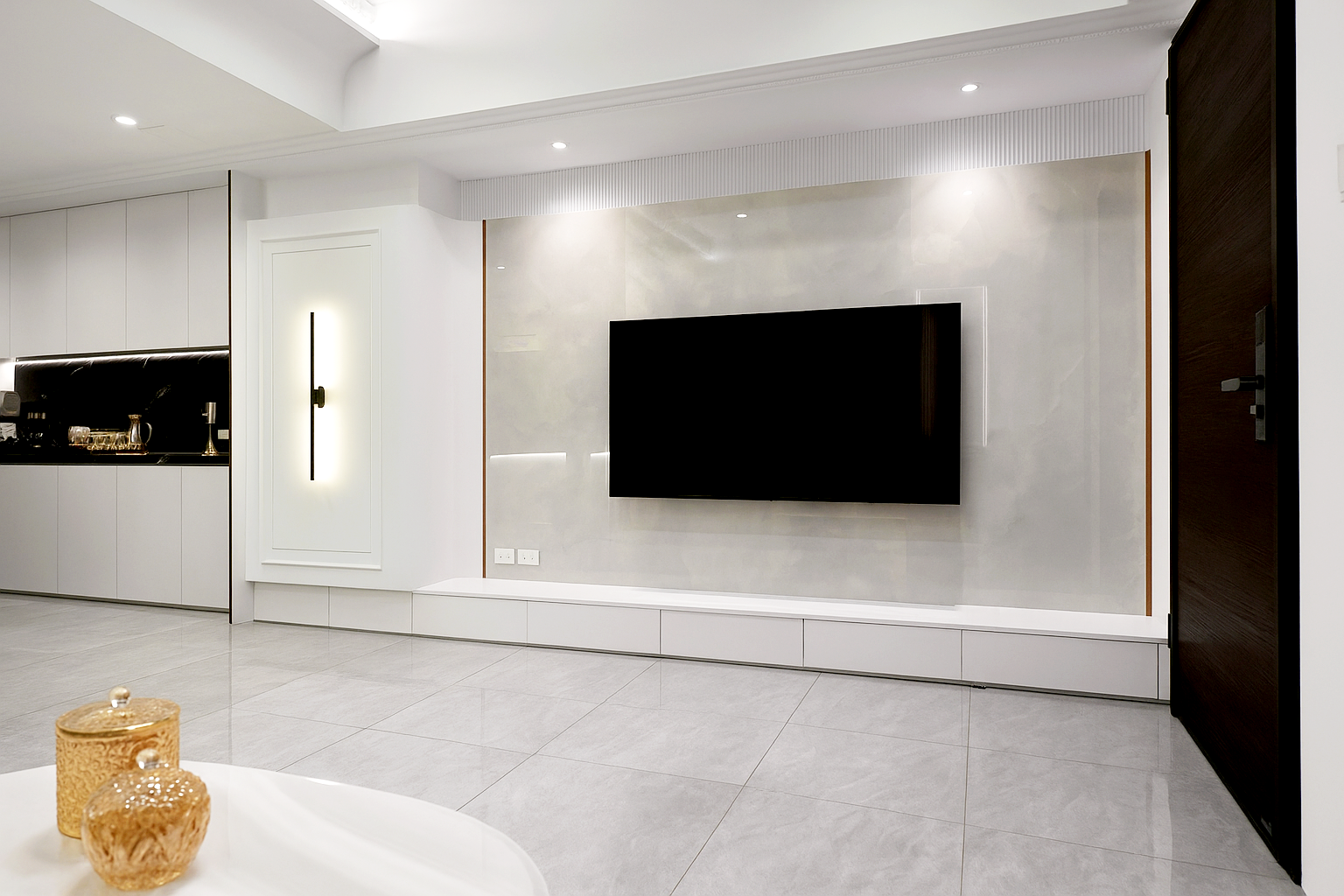 玄關以圓弧造型與羅馬柱語彙拉開序幕,客廳電視牆則選用大板磚結合造型牆面,展現石材的細膩肌理,餐廚區以開放式格局串聯動線,營造輕盈而富有生活感的場域,讓日常聚會更顯自在流暢;主臥以柔和光影搭配粉色公主氛圍,次臥則選用薰衣草紫及靛藍配色。