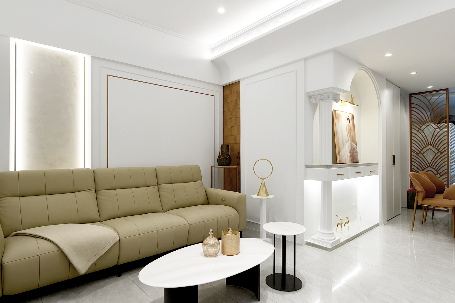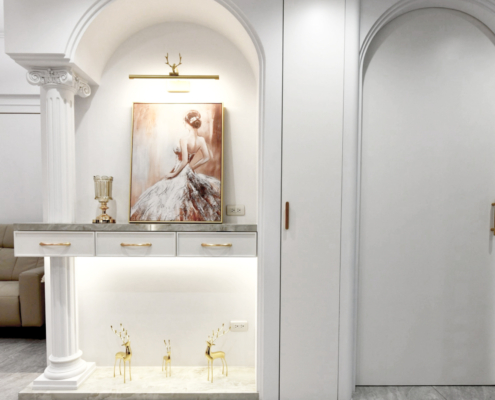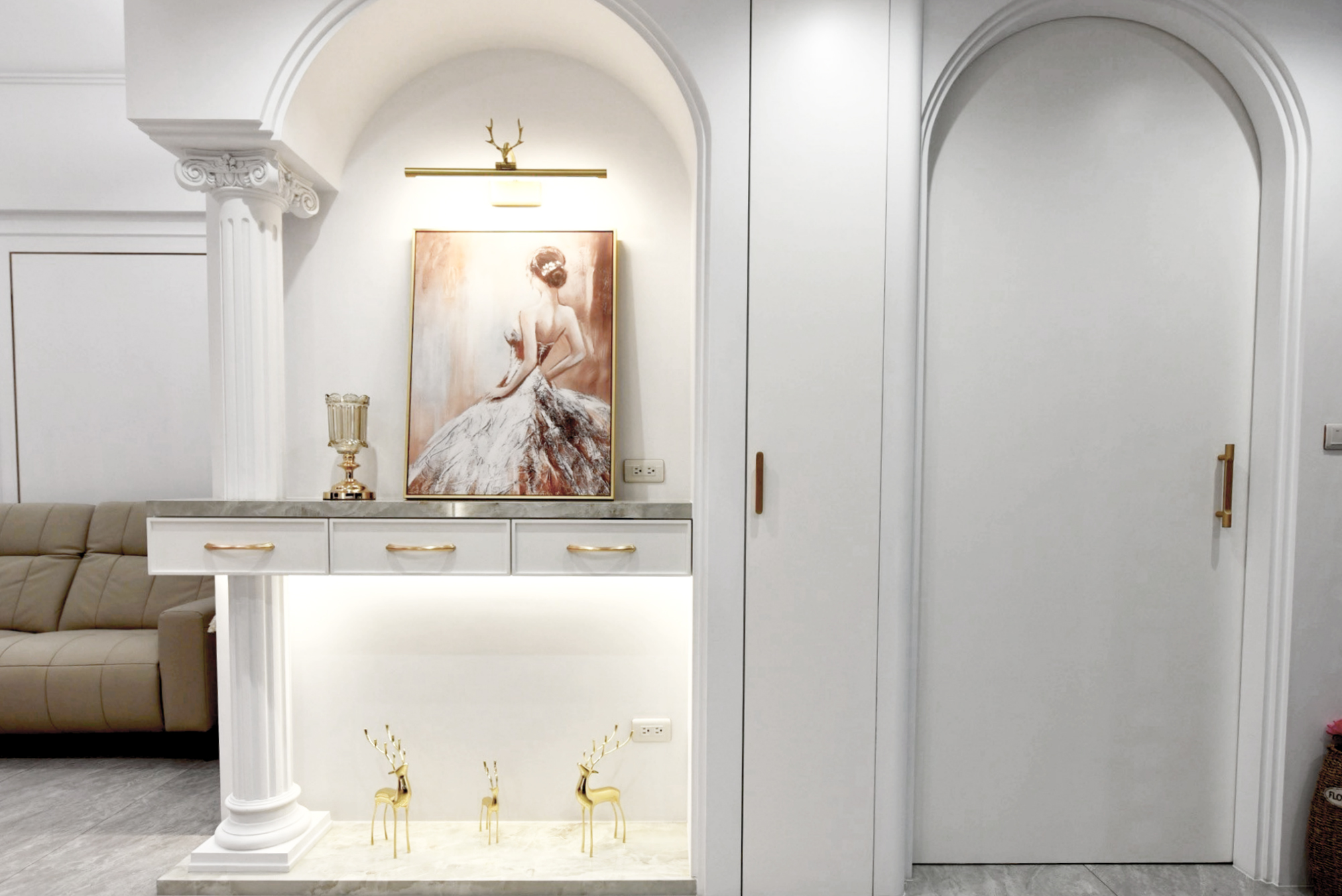 主要材料|羅馬柱、圓弧造型、大板磚、藝術吊燈、木作櫃體、鐵件、進口五金、造型牆面、鏡面、美耐板、鍍鈦飾條、軌道燈