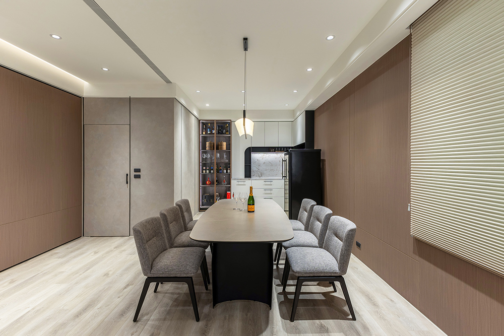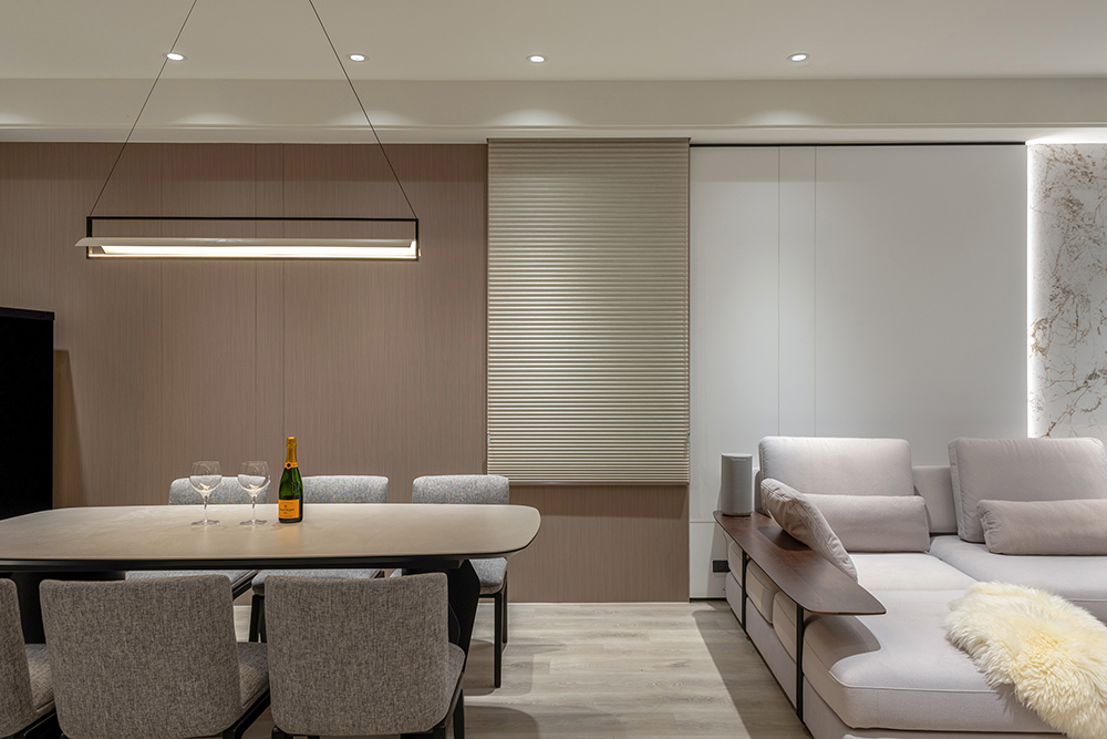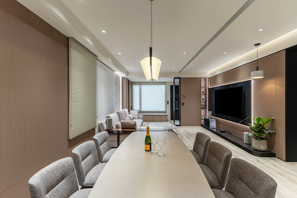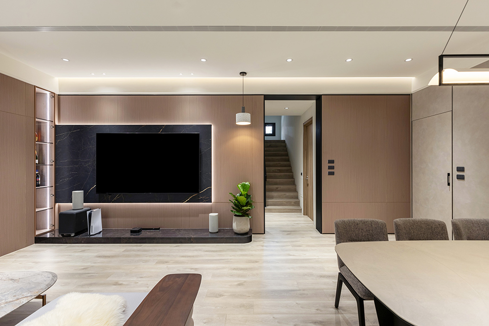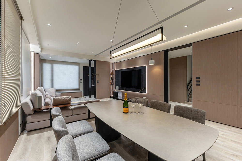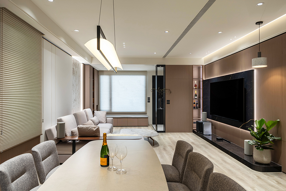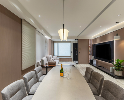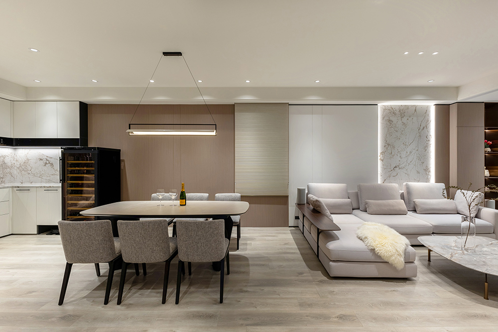 整體空間以柔和中性的色調為基底,搭配大量木質肌理與霧面材質,營造出溫潤靜謐的氛圍;客廳與餐廳採開放式配置,營造出流暢的動線,並透過隱藏收納、燈光層次與異材質拼接,精緻詮釋家的溫度與質感。