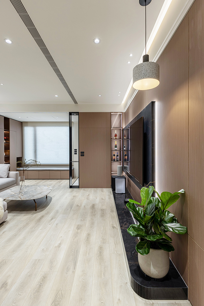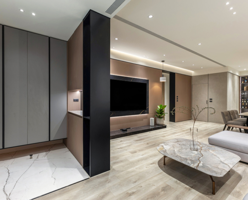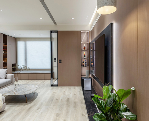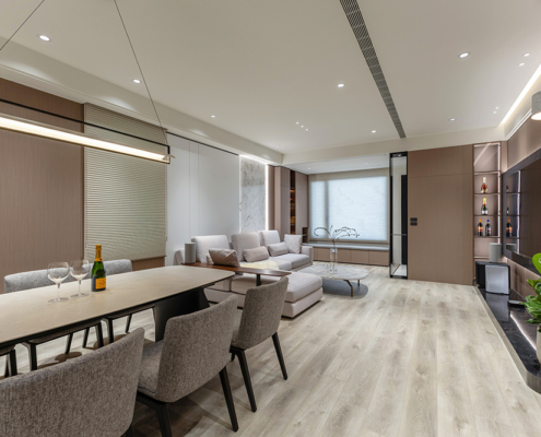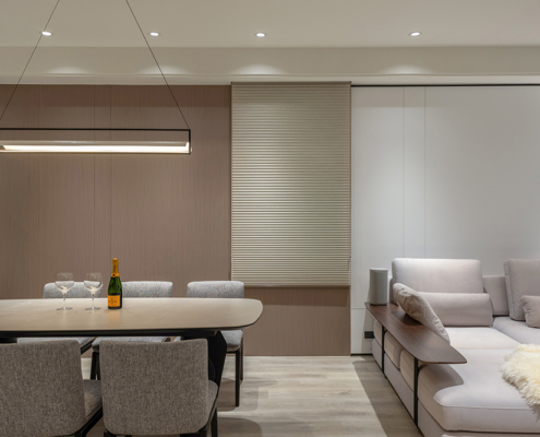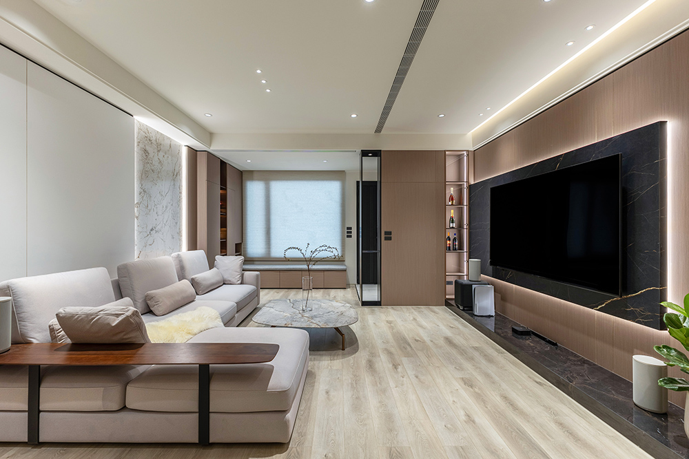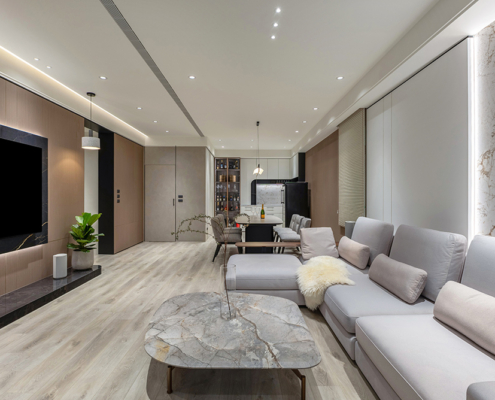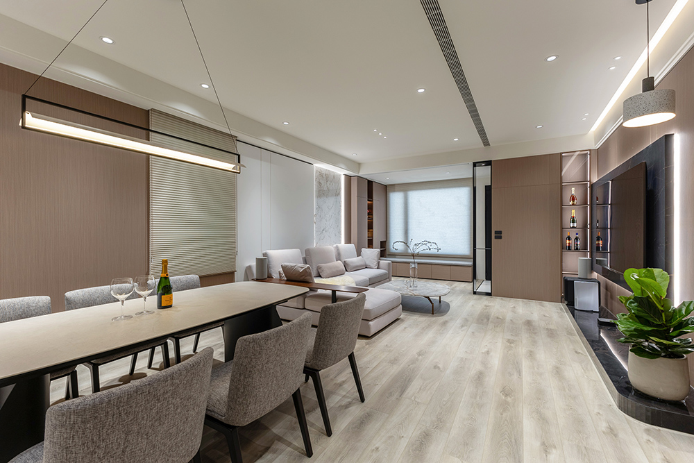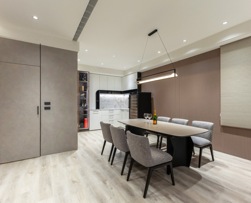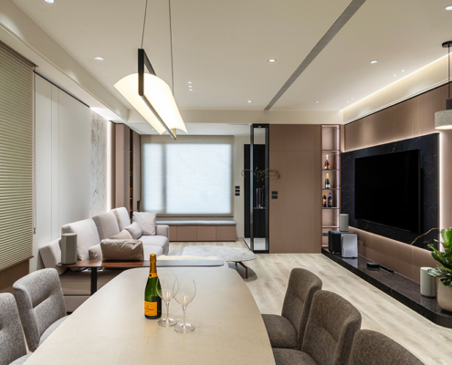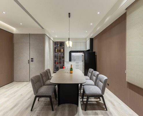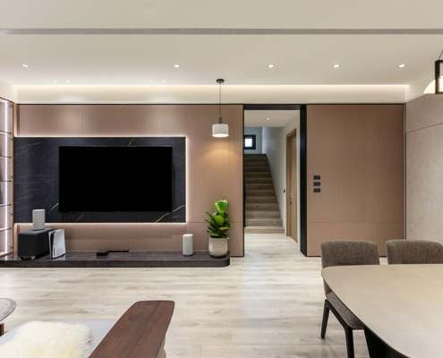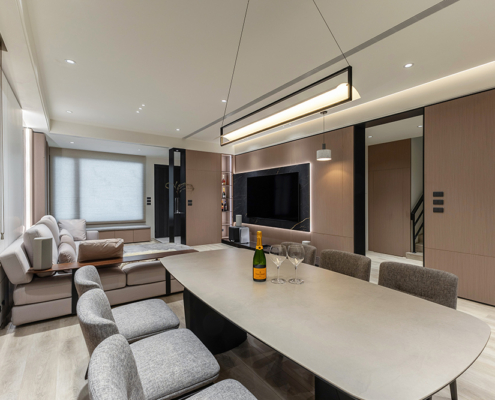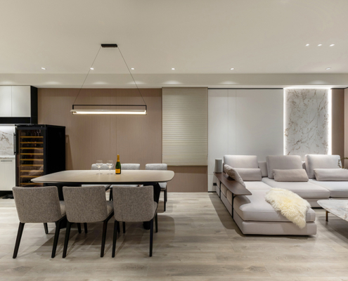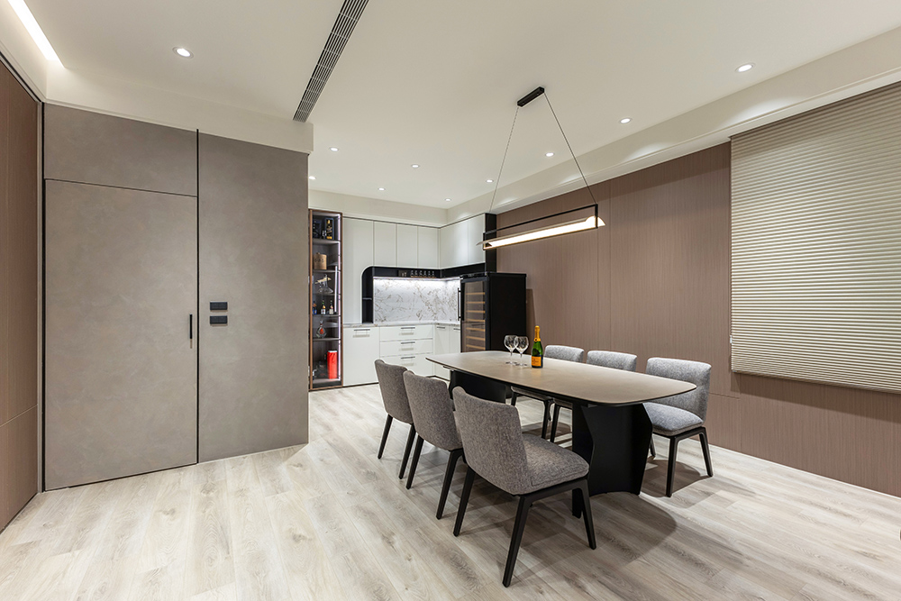 整體空間以柔和中性的色調為基底,搭配大量木質肌理與霧面材質,營造出溫潤靜謐的氛圍;客廳與餐廳採開放式配置,營造出流暢的動線,並透過隱藏收納、燈光層次與異材質拼接,精緻詮釋家的溫度與質感。