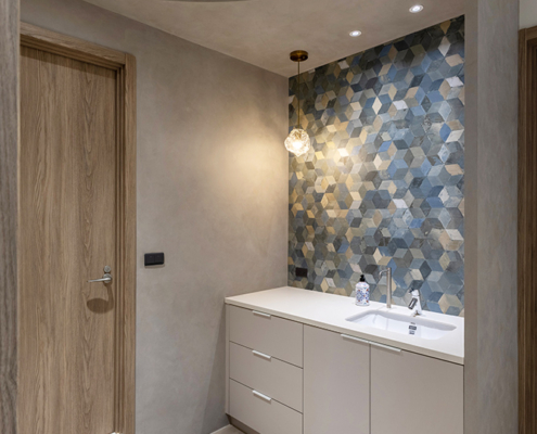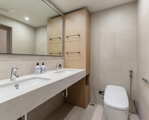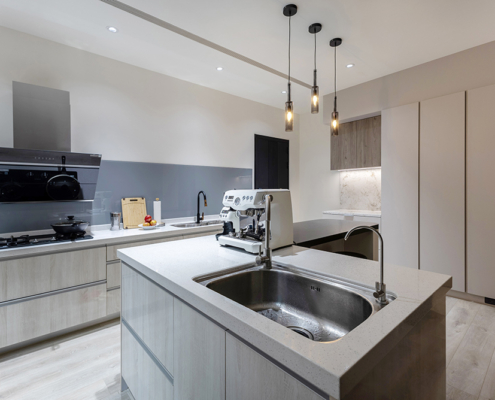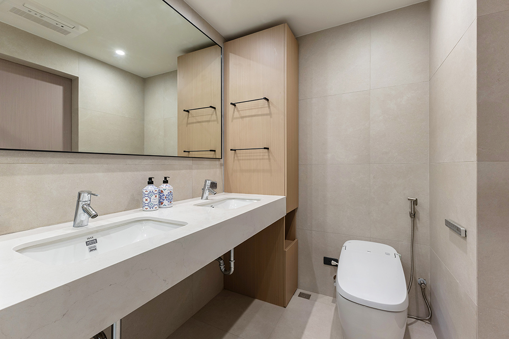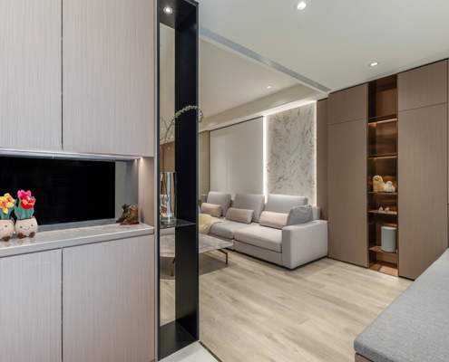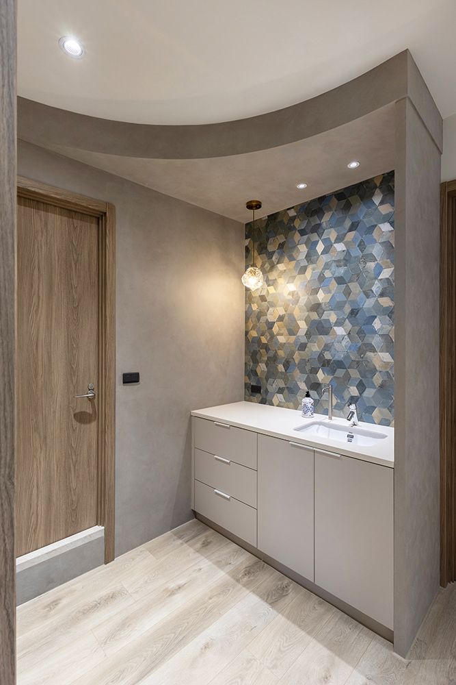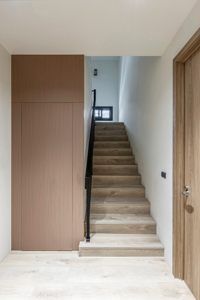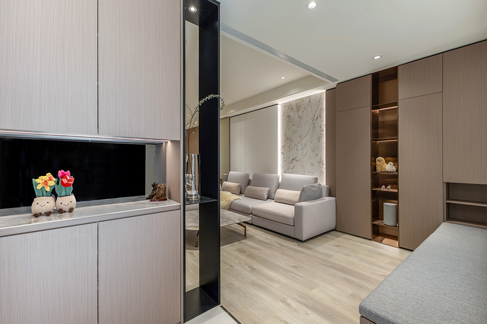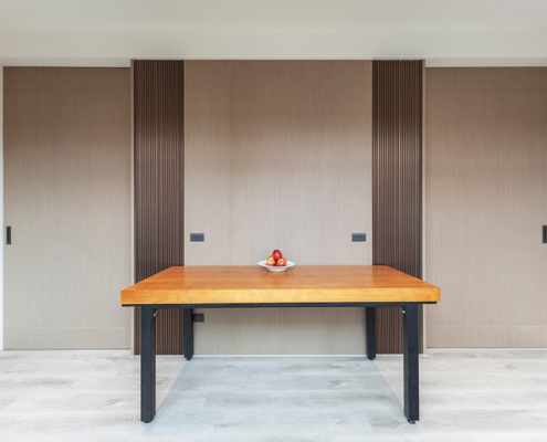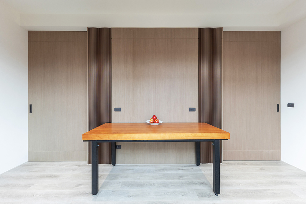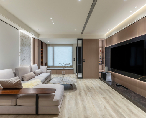 整體空間以柔和中性的色調為基底,搭配大量木質肌理與霧面材質,營造出溫潤靜謐的氛圍;客廳與餐廳採開放式配置,營造出流暢的動線,並透過隱藏收納、燈光層次與異材質拼接,精緻詮釋家的溫度與質感。
