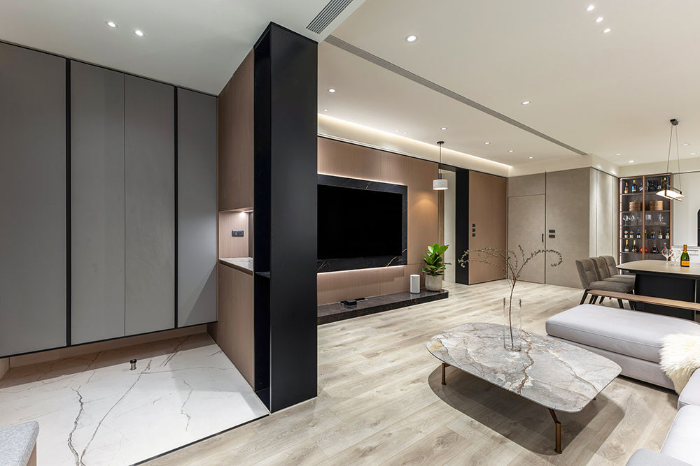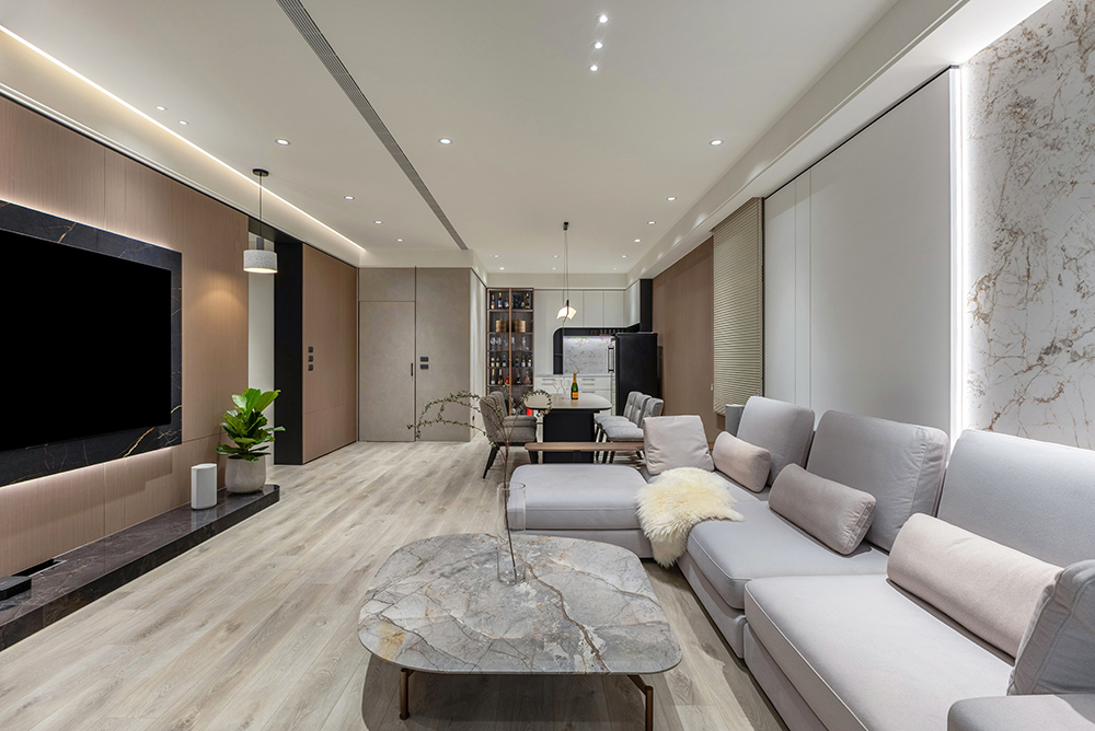 設計團隊以現代簡約為設計主軸,巧妙融合自然材質的溫潤質感與智能科技的理性機能,創造出兼具感性氛圍與實用性的理想居所。