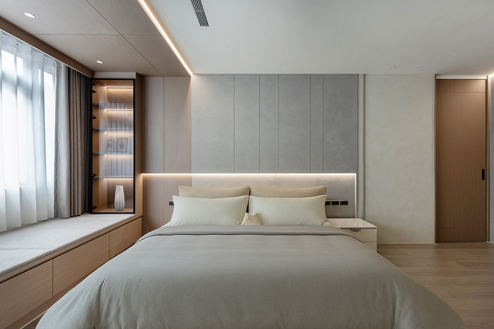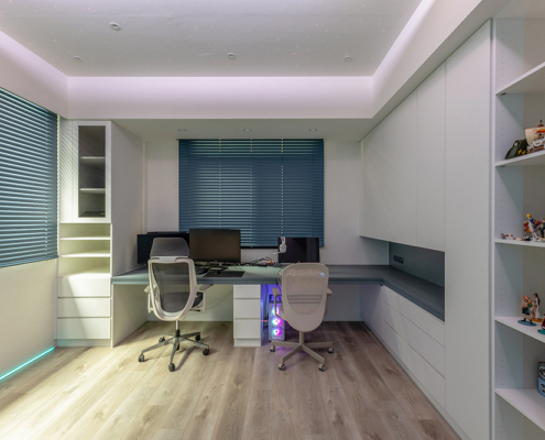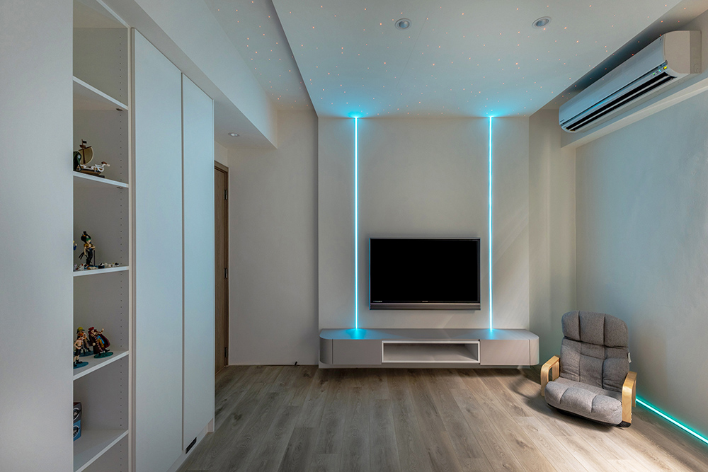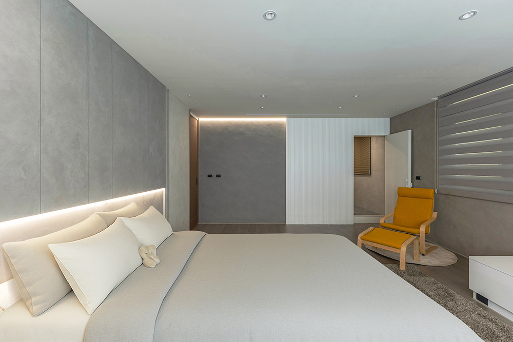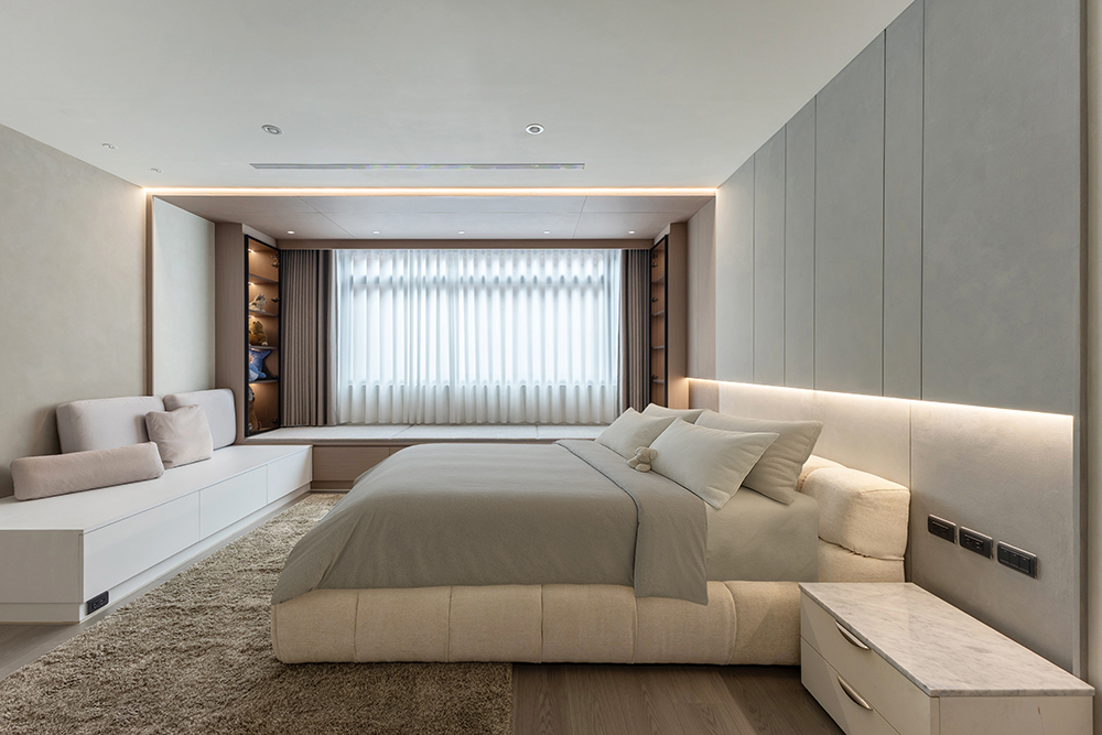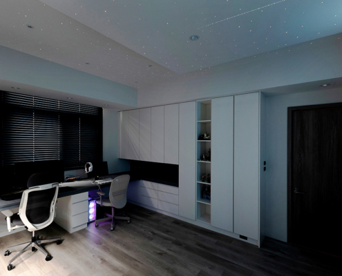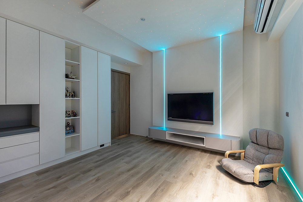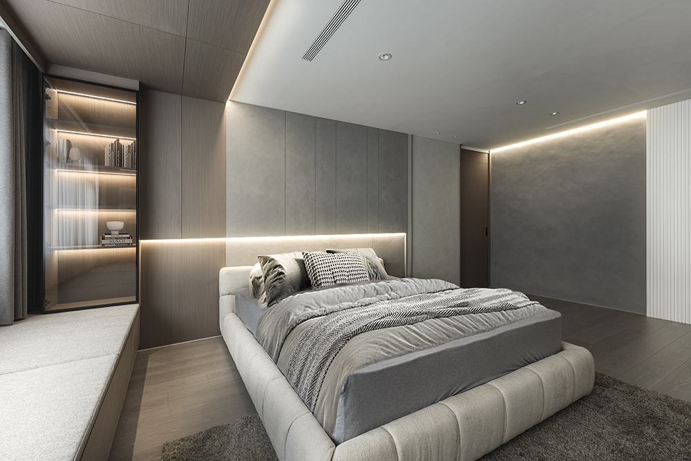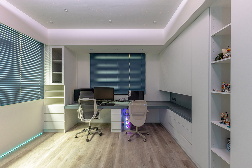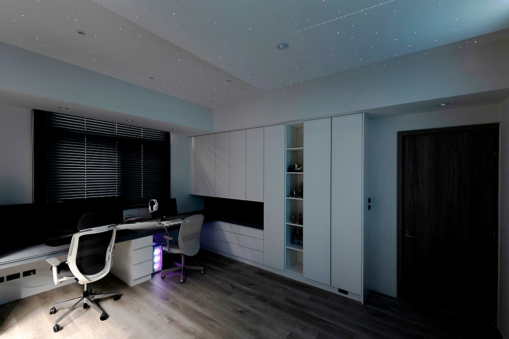 主臥空間延續同樣語彙,利用大面窗景與簡潔立面,引光入室,配合間接照明與低彩度軟裝,營造出放鬆寧靜的休憩環境;設計巧思延伸至電競房,以星空頂作為視覺亮點,在冷靜的低彩度色系中注入趣味與個性,展現屋主對生活品味的堅持,整體設計在極簡之中蘊藏層次細節,實現美感與機能兼容的當代居家想像。
