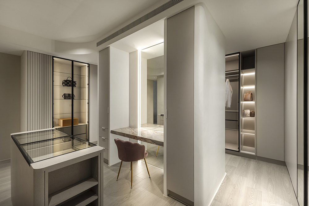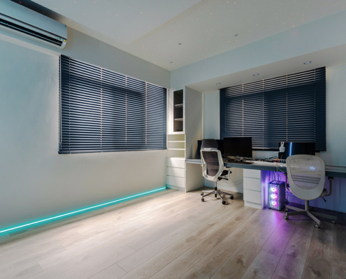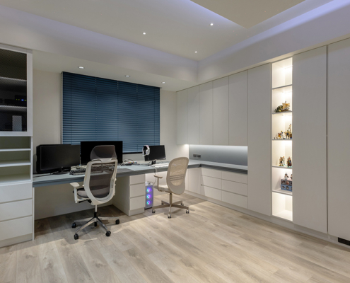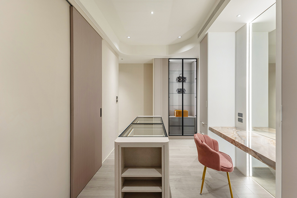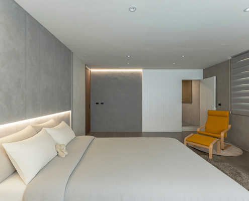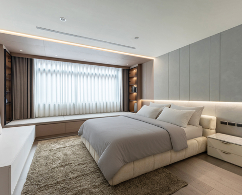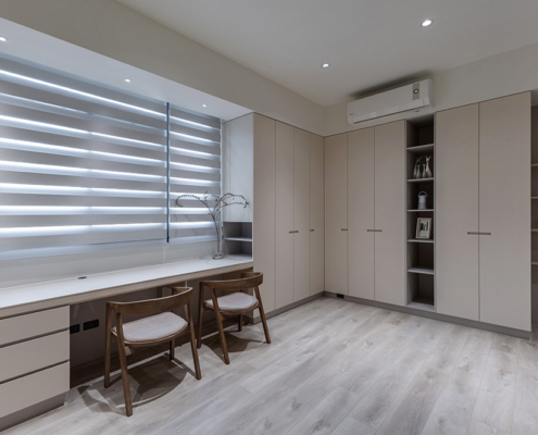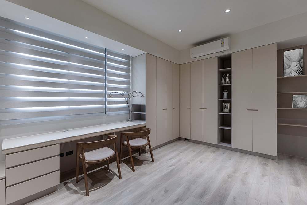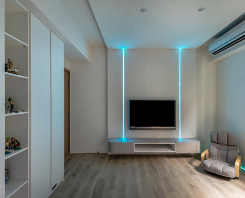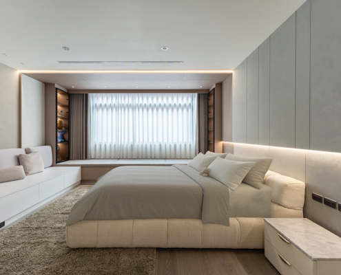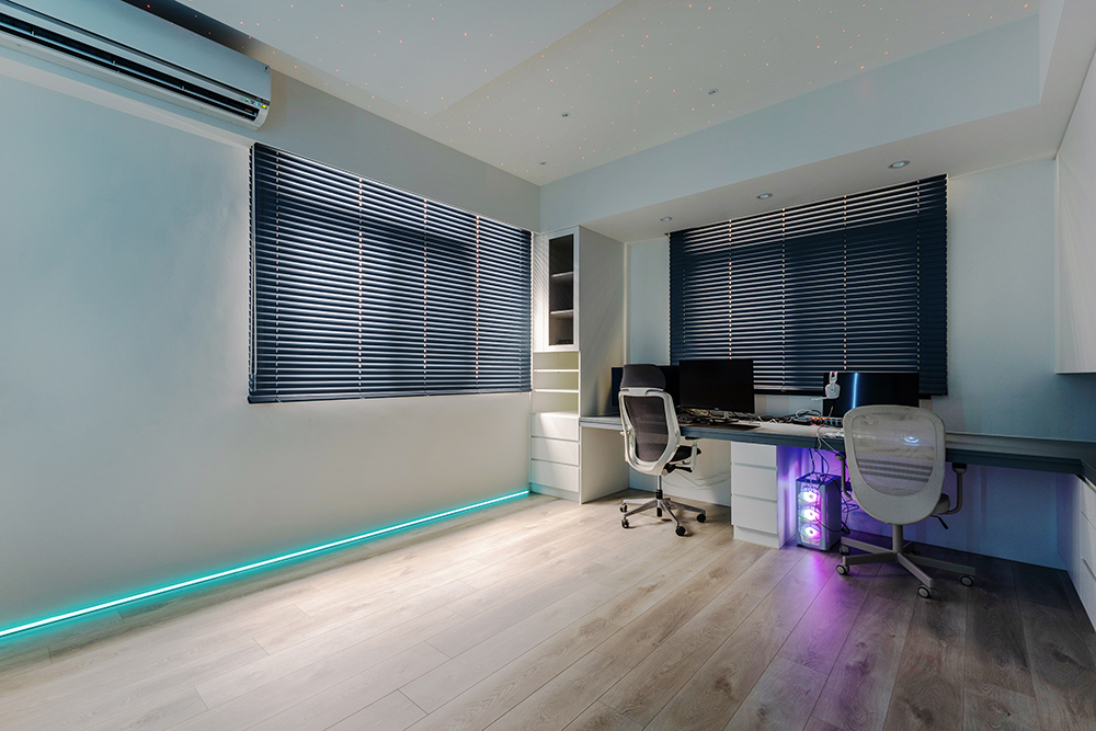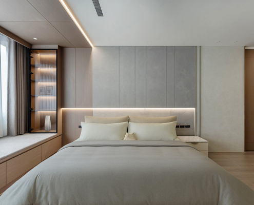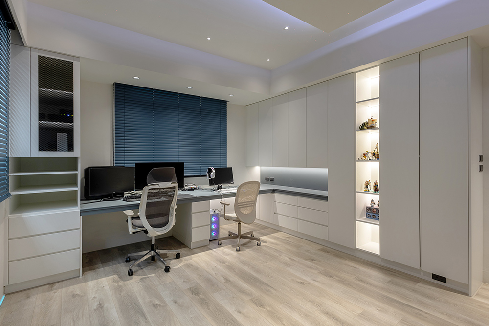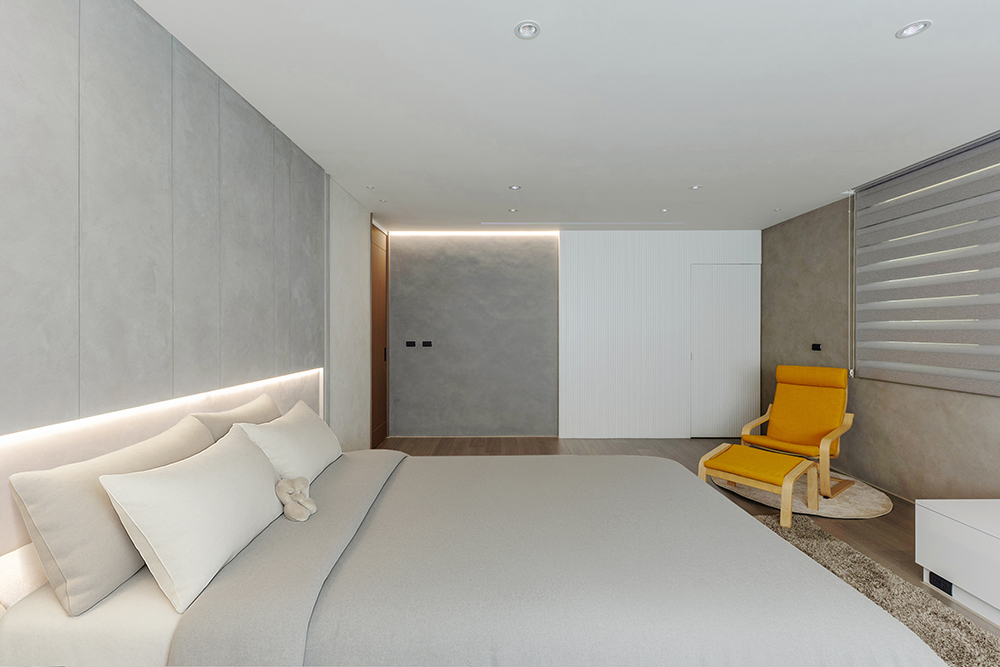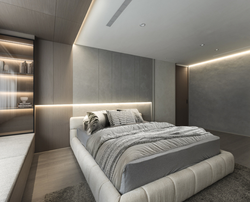 主臥空間延續同樣語彙,利用大面窗景與簡潔立面,引光入室,配合間接照明與低彩度軟裝,營造出放鬆寧靜的休憩環境;設計巧思延伸至電競房,以星空頂作為視覺亮點,在冷靜的低彩度色系中注入趣味與個性,展現屋主對生活品味的堅持,整體設計在極簡之中蘊藏層次細節,實現美感與機能兼容的當代居家想像。