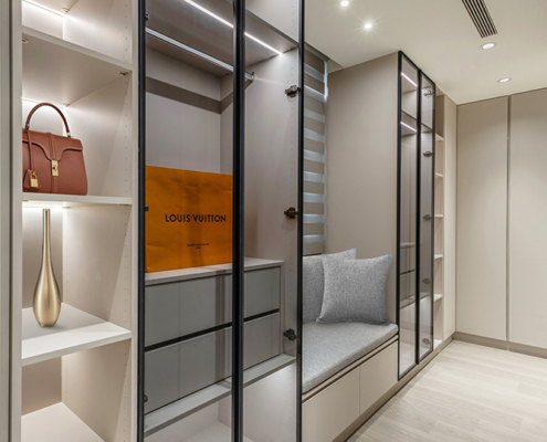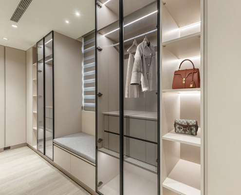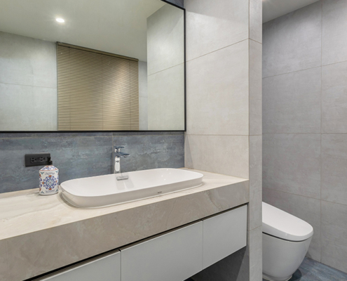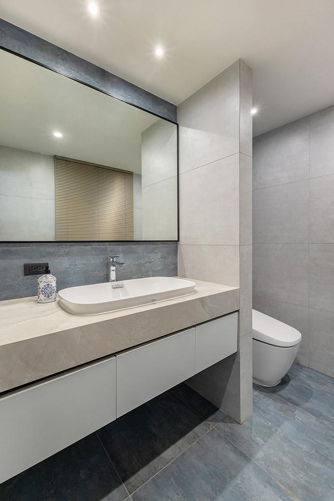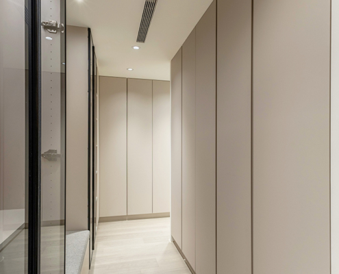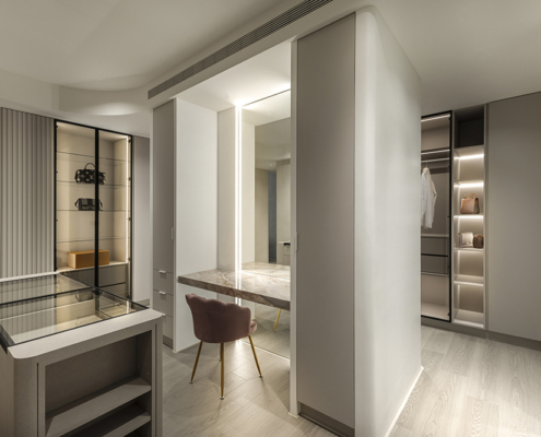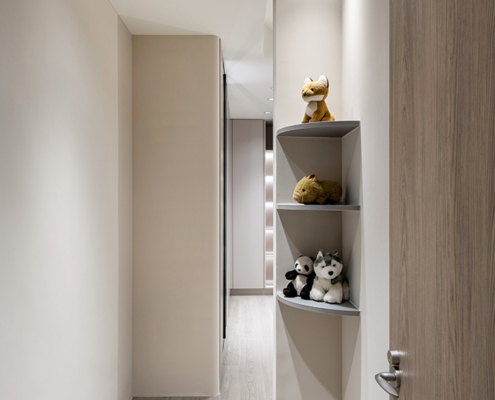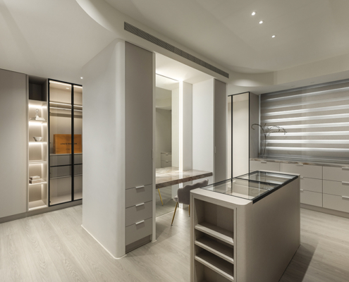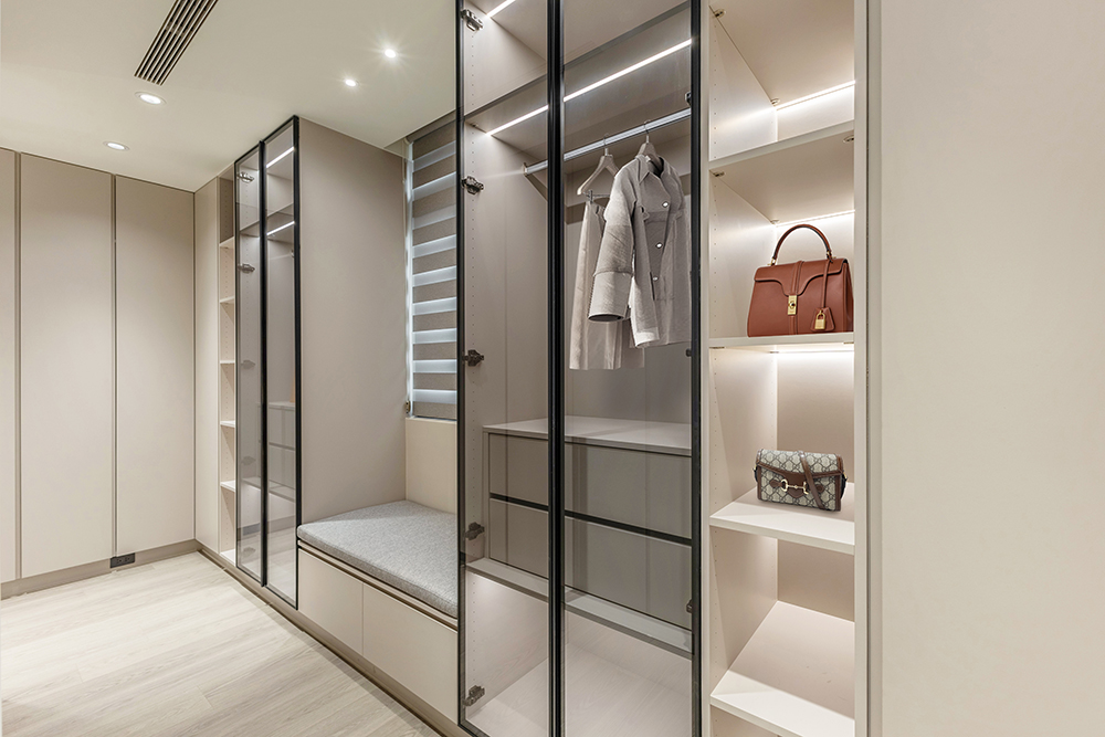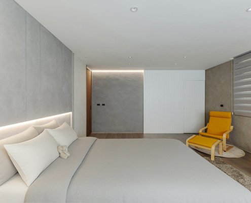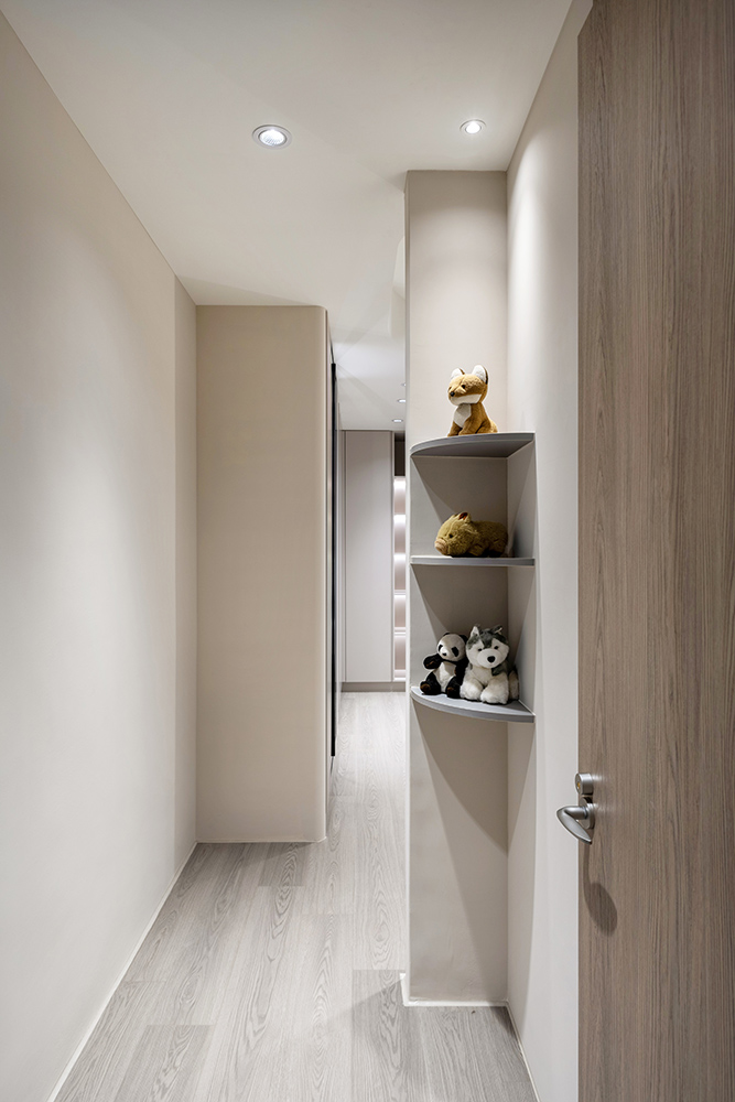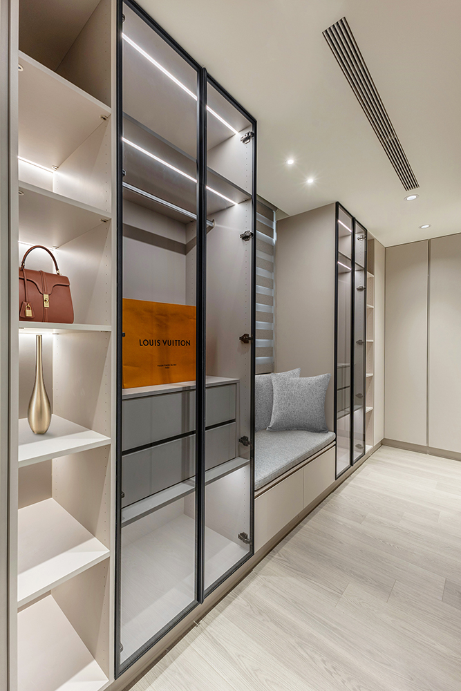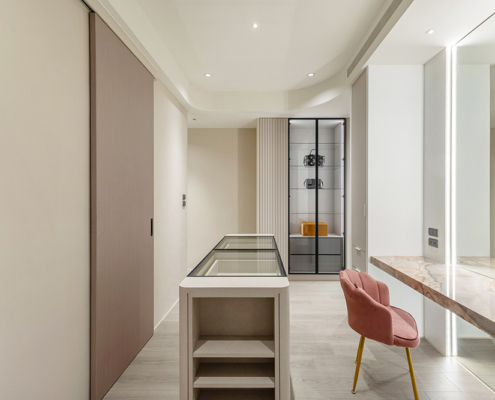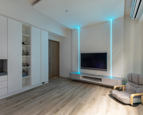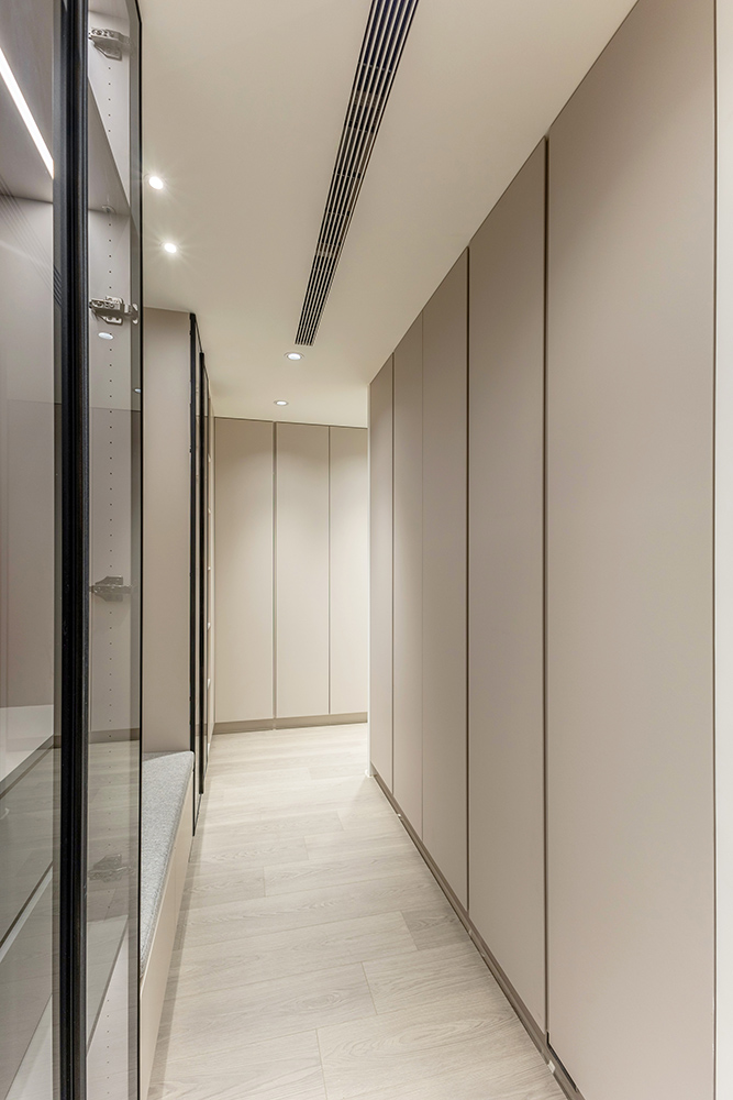 主臥空間延續同樣語彙,利用大面窗景與簡潔立面,引光入室,配合間接照明與低彩度軟裝,營造出放鬆寧靜的休憩環境;設計巧思延伸至電競房,以星空頂作為視覺亮點,在冷靜的低彩度色系中注入趣味與個性,展現屋主對生活品味的堅持,整體設計在極簡之中蘊藏層次細節,實現美感與機能兼容的當代居家想像。
