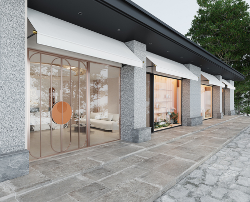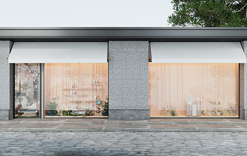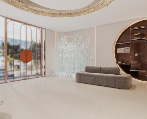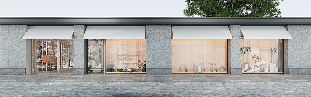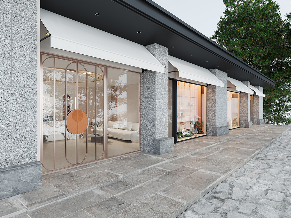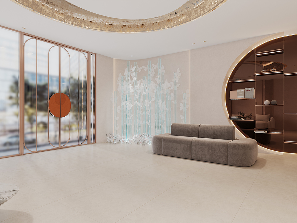 櫥窗展示區搭配沉穩大板磚與藝術漆,清晰呈現品牌形象,轉進大廳接待時,鍍鈦飾條、鏡面結合圓弧造型牆面搭配藝術燈光,營造高級且優雅的迎賓印象。