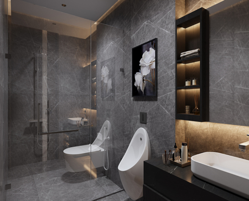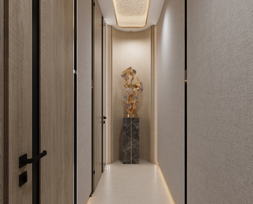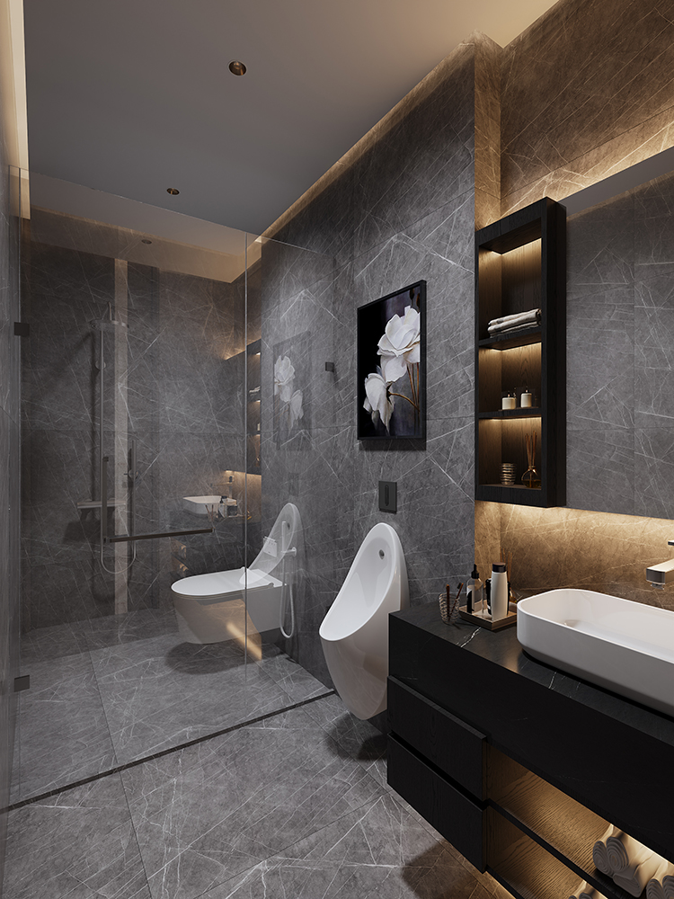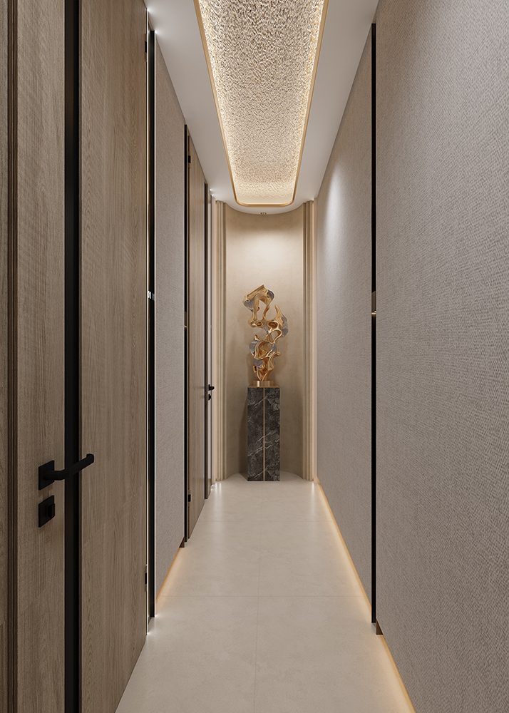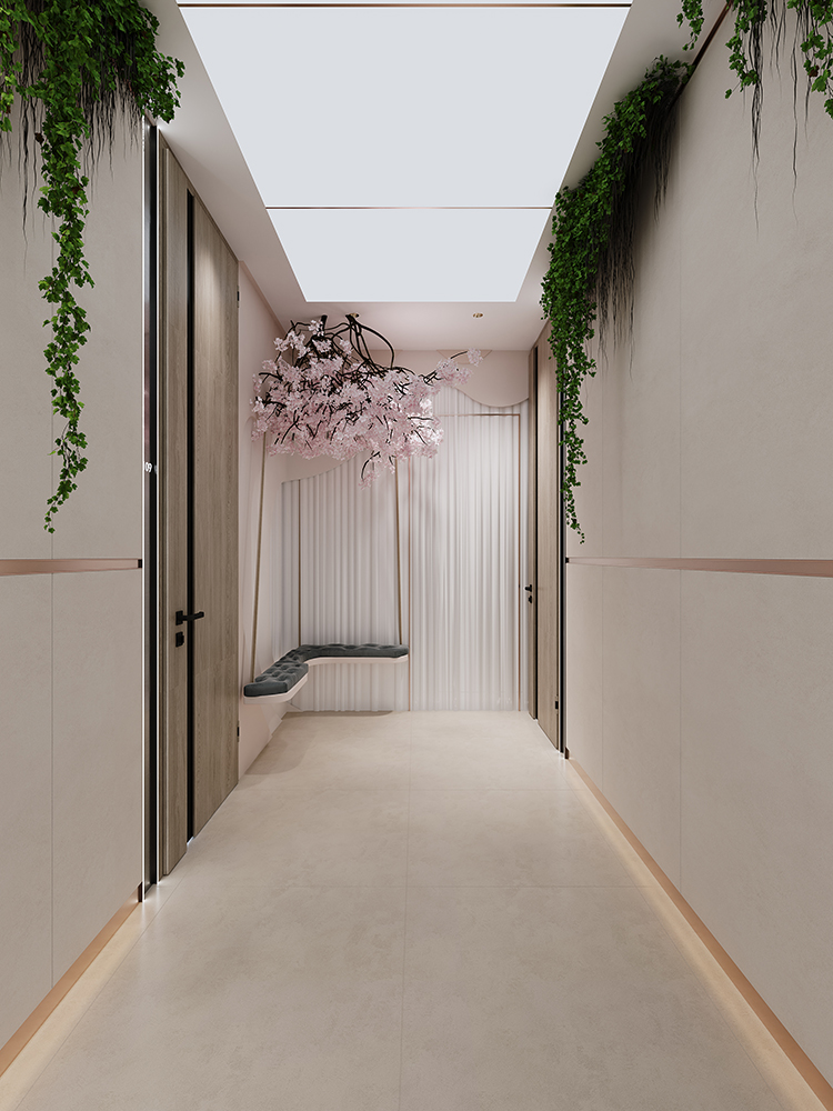 使空間流線舒緩、動線自然,通往男女賓客區域的廊道以不同主題呈現,男士區域採用中性設計,展現沉穩、高雅;女士區域則結合花卉及藝術漆,加強柔性與優雅感。