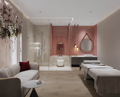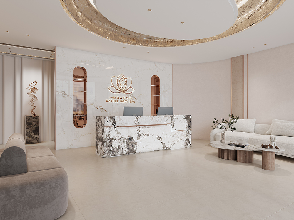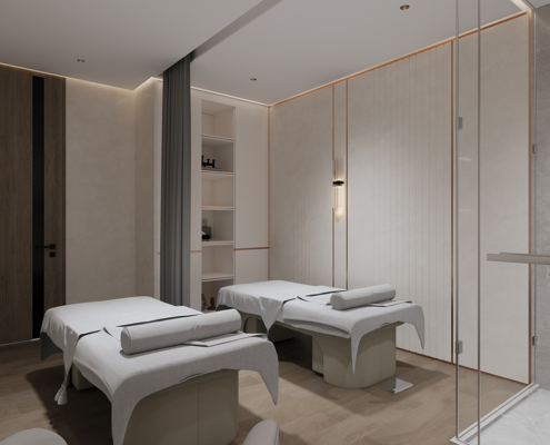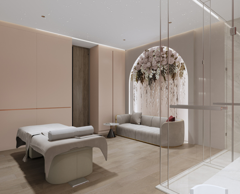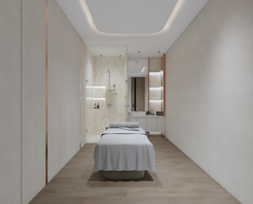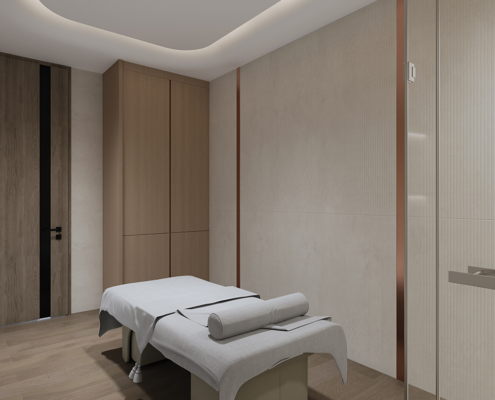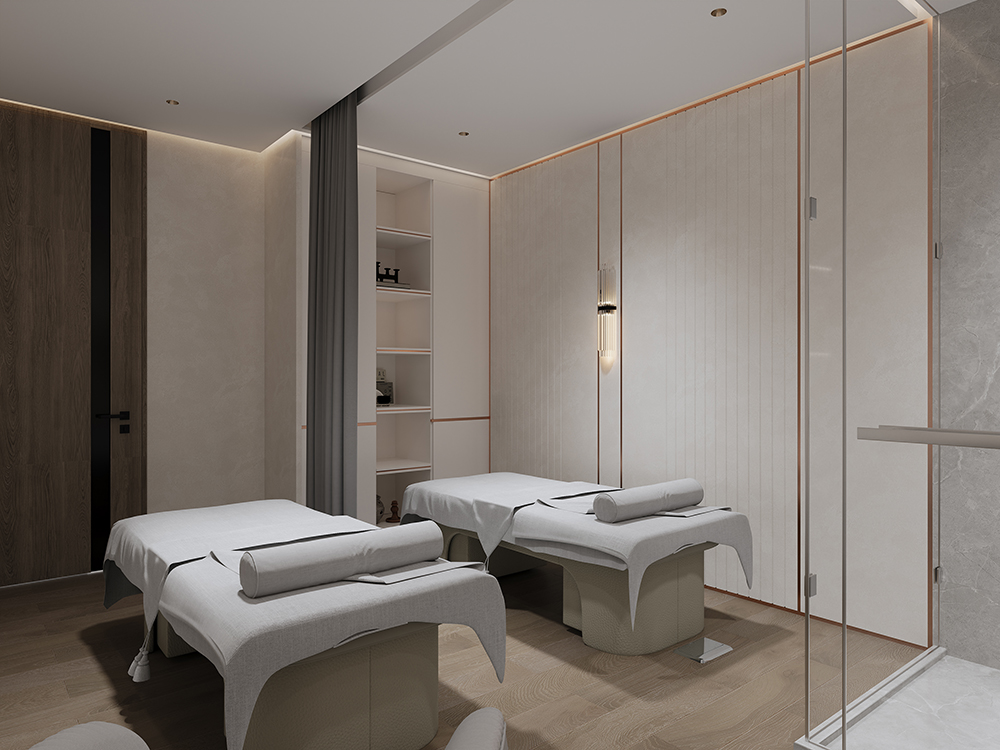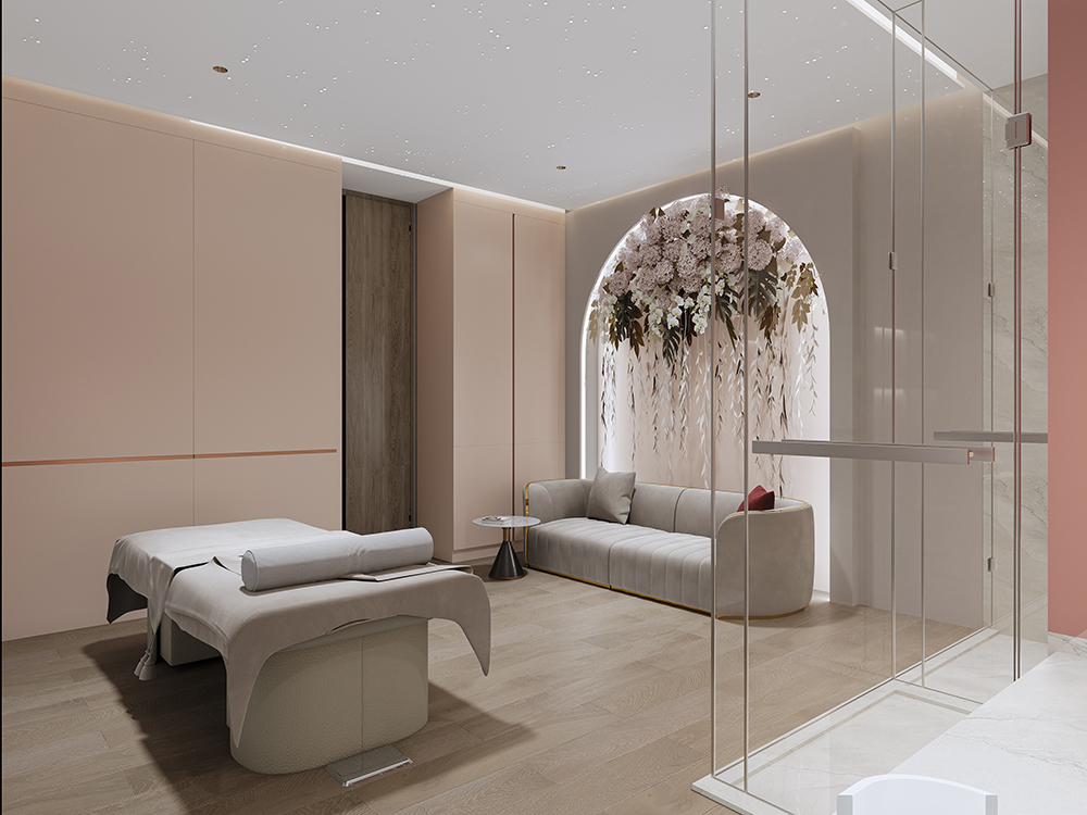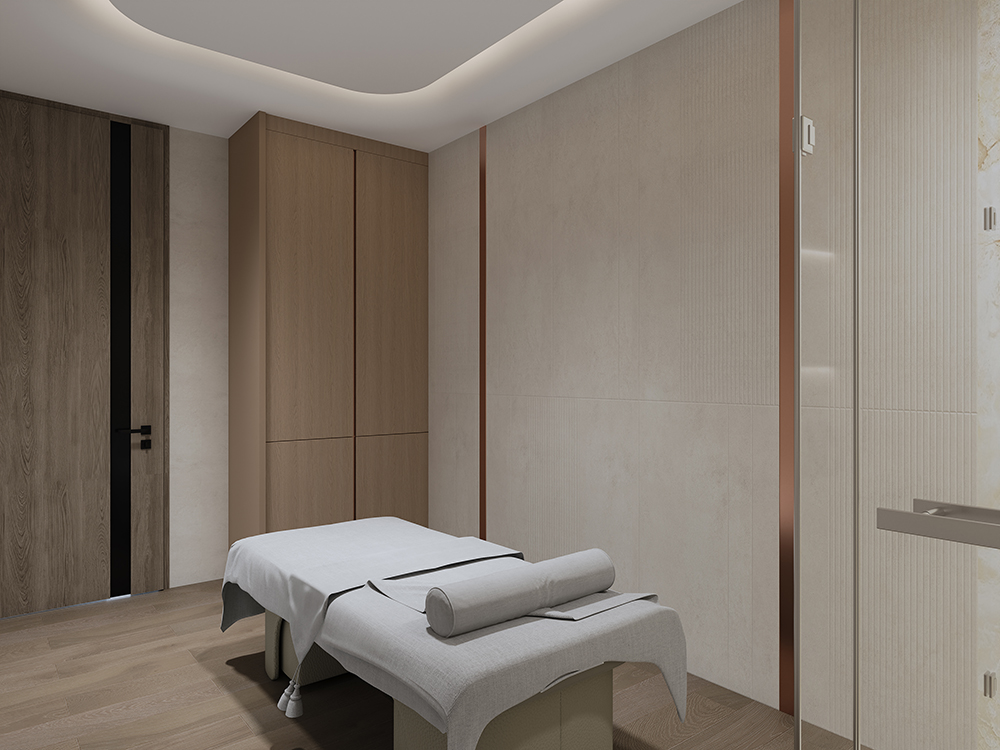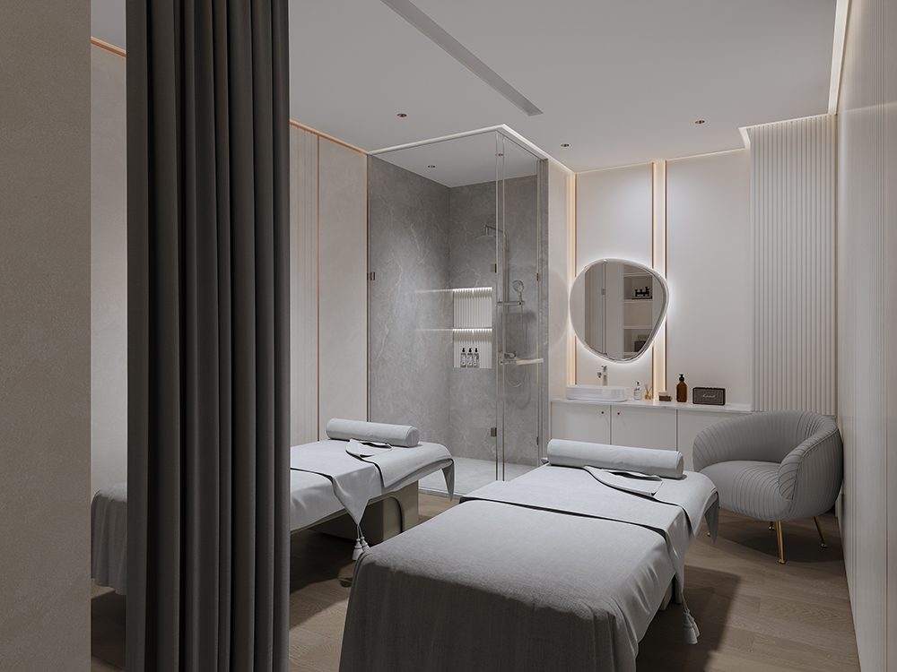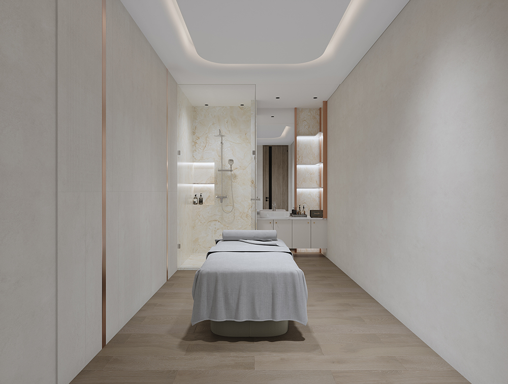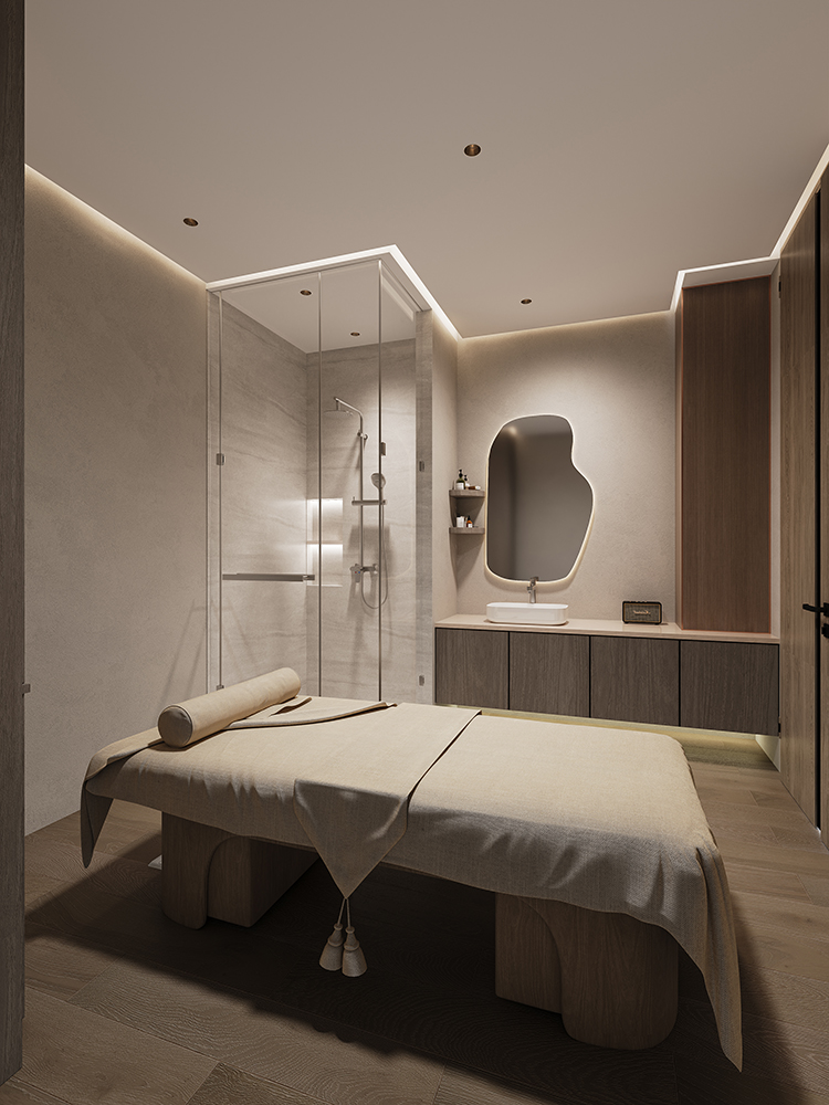 以柔性線條與鏡面材質引導視覺流動,為貴賓打造兼具專業與舒適感的SPA體驗空間。