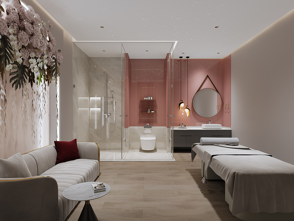 包廂區分為男女士包廂與 VIP 私密空間,每個包廂設計不同主題,再以打卡牆面增添品牌特色,營造時尚氛圍與沉浸式體驗,整體設計注重材質對比與光影節奏控制,從接待大廳到包廂內外引導,構築流暢動線與視覺層次,實現一處專屬尊榮體驗的輕奢美容SPA會館。